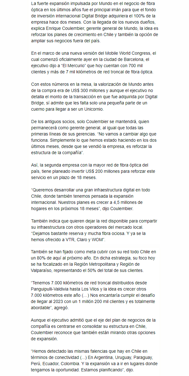 EL MERCURIO – Compañía tiene planeado duplicar la red de fibra óptica ante la alta demanda y mayor digitalización que experimenta el país.