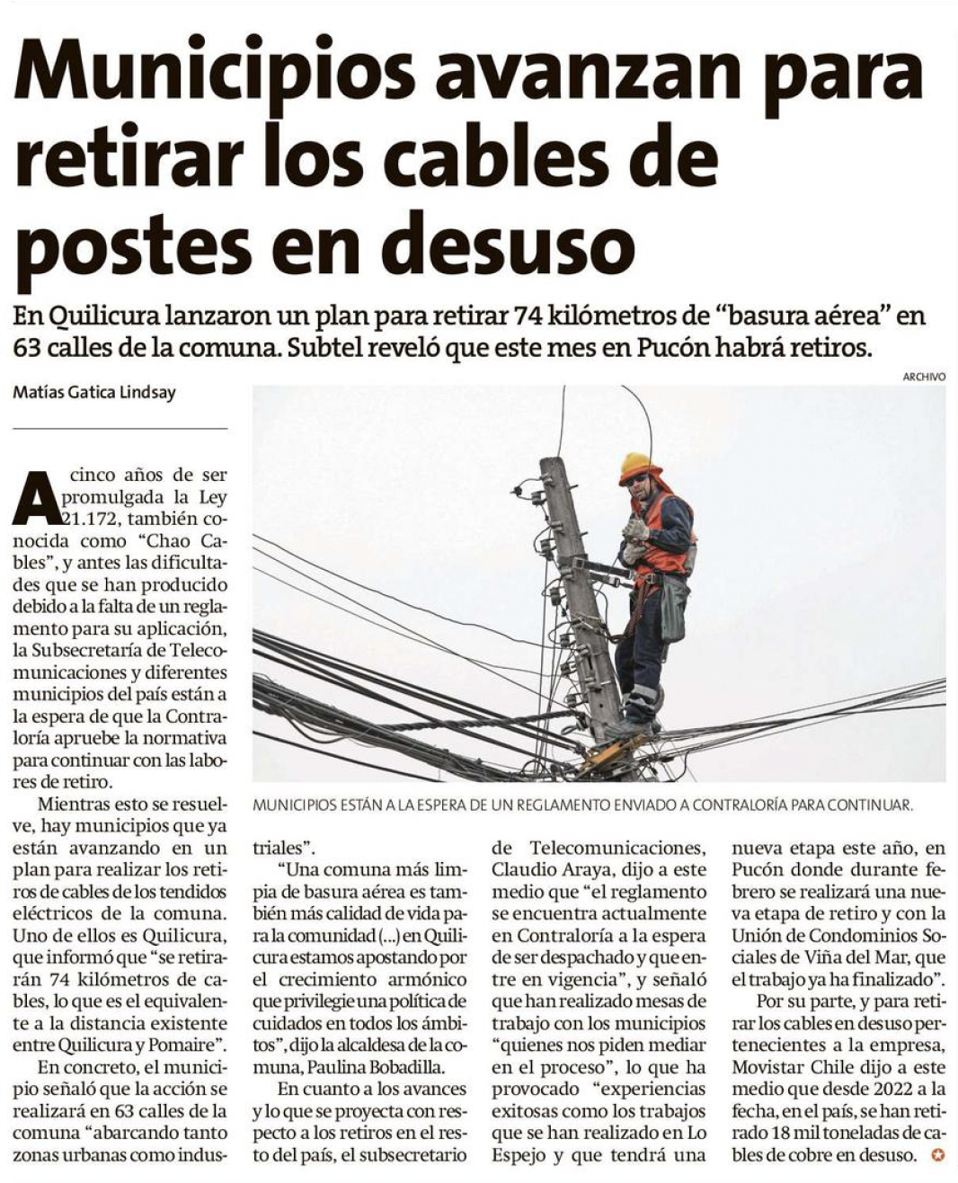 EL LÍDER SAN ANTONIO – En Quilicura lanzaron un plan para retirar 74 kilómetros de “basura aérea” en 63 calle de la comuna. Subtel reveló que este mes en Pucón habrá retiros