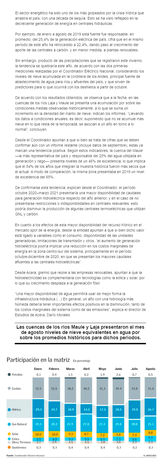 EL MERCURIO – Después de una década, y a falta de un último reporte, el análisis apunta a un año “normal”, que impulsaría un mayor uso de centrales hidroeléctricas, en detrimento de las térmicas a carbón y a gas.
