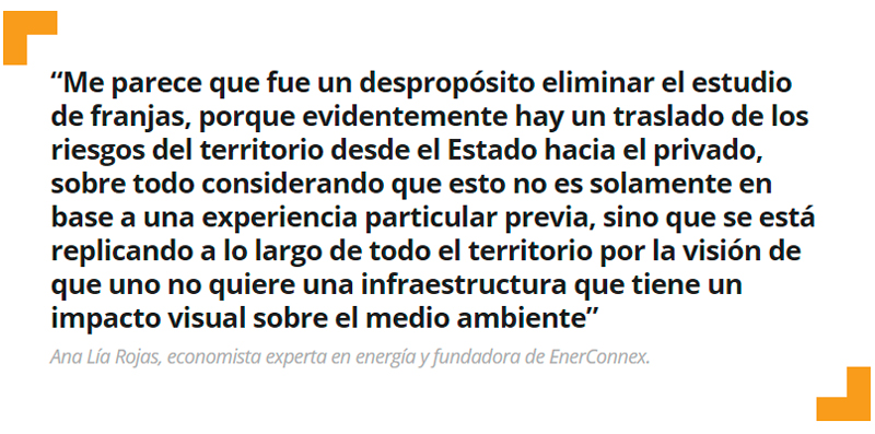 Y por ello, agrega “a mi me parece que fue un despropósito eliminar el estudio de franjas, porque evidentemente hay un traslado de los riesgos del territorio desde el Estado hacia el privado, sobre todo considerando que esto no es solamente en base a una experiencia particular previa, sino que se está replicando a lo largo de todo el territorio por la visión de que uno no quiere un activo, una infraestructura que tiene impacto visual sobre el medio ambiente, y sobre todo desde el punto de vista de la ocupación territorial”.