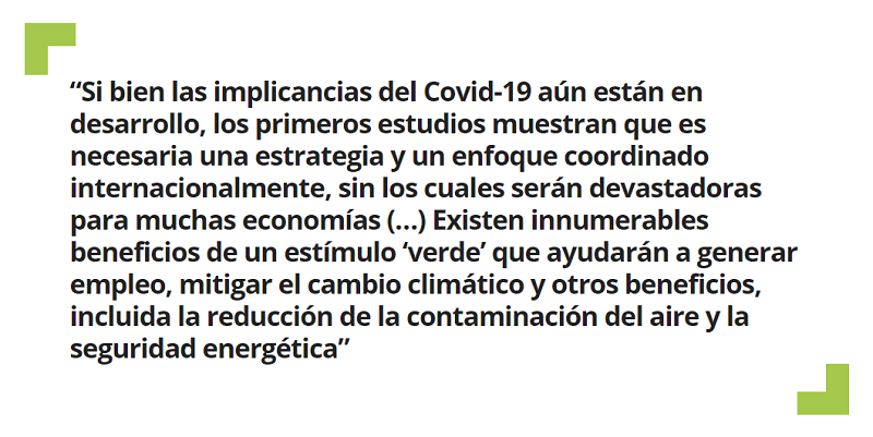 “Si bien las implicancias del Covid-19 aún están en desarrollo, los primeros estudios muestran que es necesaria una estrategia y un enfoque coordinado internacionalmente, sin los cuales serán devastadoras para muchas economías, y podría terminar atrapando especialmente a los países en desarrollo en la pobreza por décadas (…) Existen innumerables beneficios de un estímulo ‘verde’ que ayudarán a generar empleo, mitigar el cambio climático y otros beneficios, incluida la reducción de la contaminación del aire y la seguridad energética”, afirma el estudio.