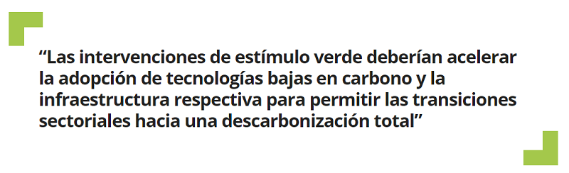 Por último, un tercer punto es la promoción de la descarbonización y de las perspectivas de crecimiento sostenible. “Las intervenciones de estímulo verde deberían acelerar la adopción de tecnologías bajas en carbono y la infraestructura respectiva para permitir las transiciones sectoriales hacia una descarbonización total”.