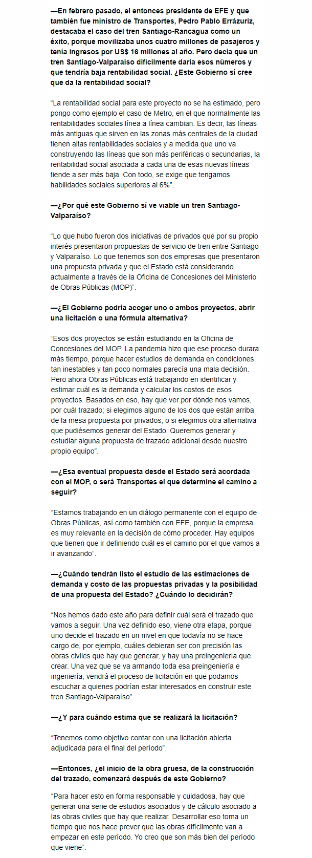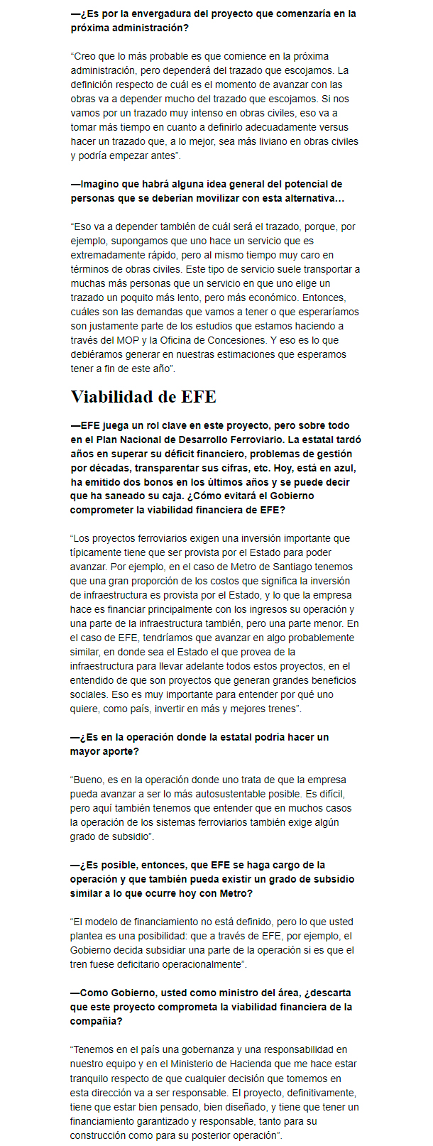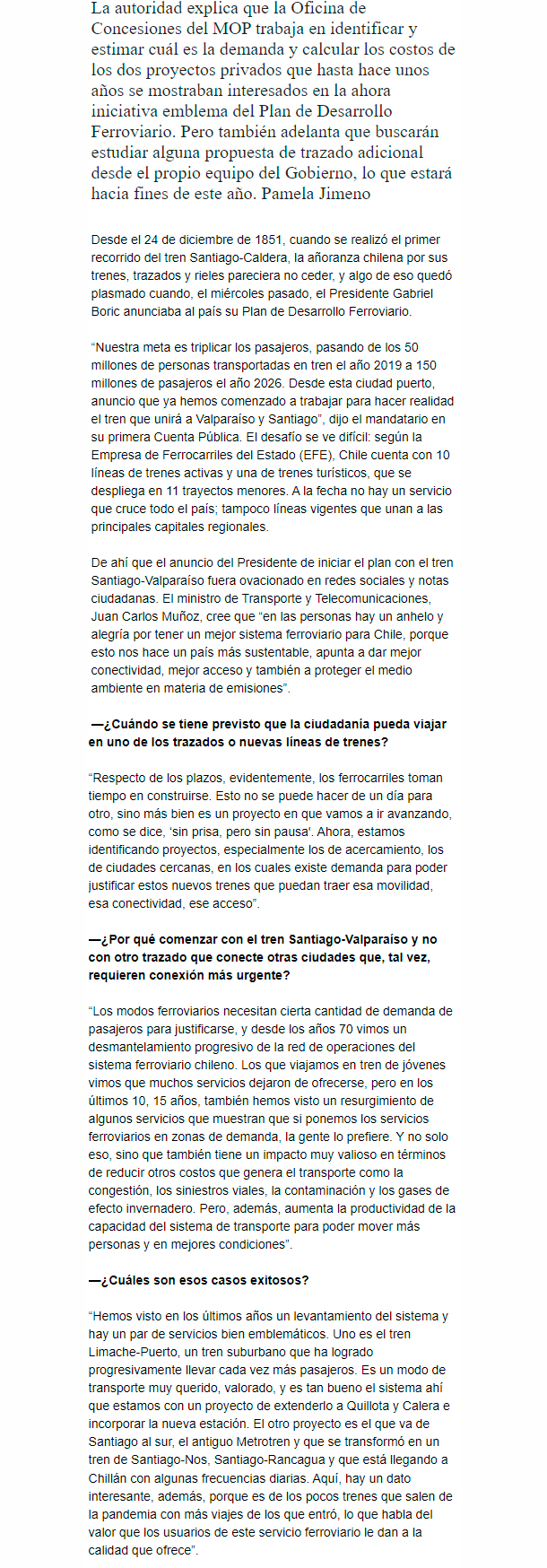 EL MERCURIO – El ministro Muñoz explica que la Oficina de Concesiones del MOP trabaja en identificar y estimar cuál es la demanda y calcular costos de los dos proyectos privados interesados.