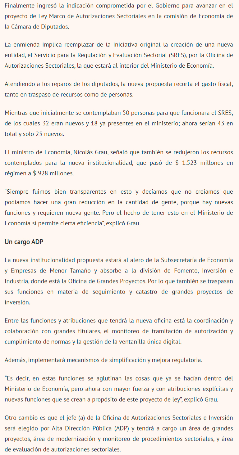 DIARIO FINANCIERO – Gobierno ingresó indicación que propone la Oficina de Autorizaciones Sectoriales, que estará al interno del Ministerio de Economía y requerirá menos personas
