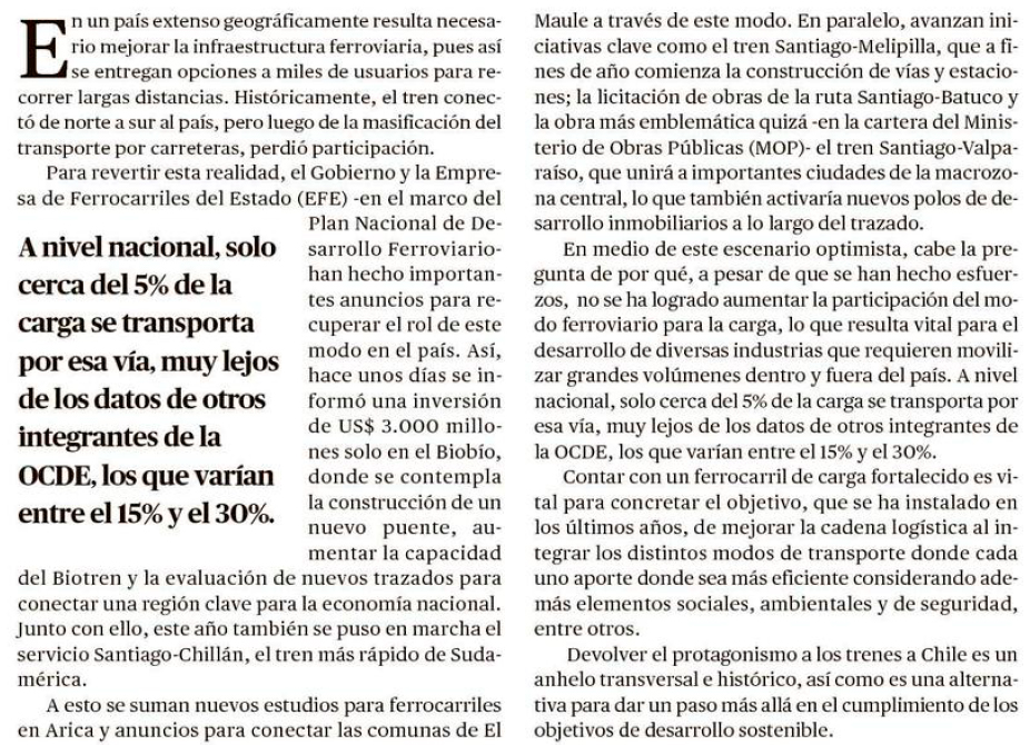 CRÓNICA DE CHILLÁN – A nivel nacional, solo cerca del 5% de la carga se transporta por esa vía, muy lejos de los datos de otros integrantes de la OCDE, los que varían entre el 15% y el 30%