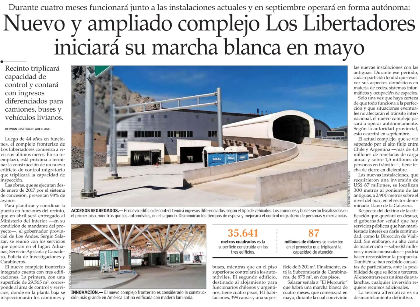 EL MERCURIO – Luego de 44 años en funciones, el complejo fronterizo de Los Libertadores comienza a vivir sus últimos meses. En su remplazo, está próxima a terminar la construcción de un nuevo edificio de control migratorio que triplicará la capacidad de inspección.