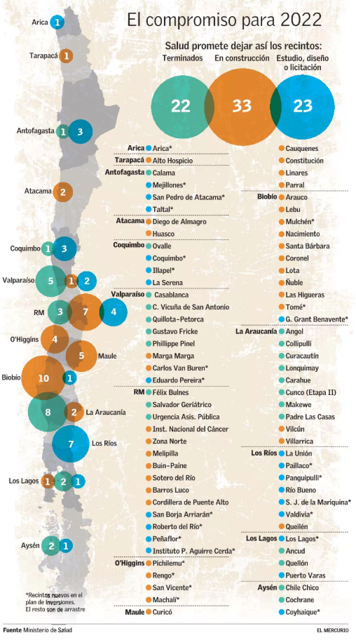 Esos nuevos proyectos corresponden a los hospitales de Pichilemu, Rengo, San Vicente, Machalí, Mulchén, Tomé (todos ellos quedarán en construcción en 2022), Arica, Mejillones, San Pedro de Atacama, Taltal, Coquimbo, Illapel, Carlos van Buren de Valparaíso, Eduardo Pereira de Valparaíso, Guillermo Grant Benavente de Concepción, Coyhaique, San Borja Arriarán en Santiago, Los Lagos, Paillaco, Panguipulli, San José de la Mariquina, Valdivia, Roberto del Río en la capital, Peñaflor y el Instituto Pedro Aguirre Cerda (para quedar en estudio, diseño o licitación).