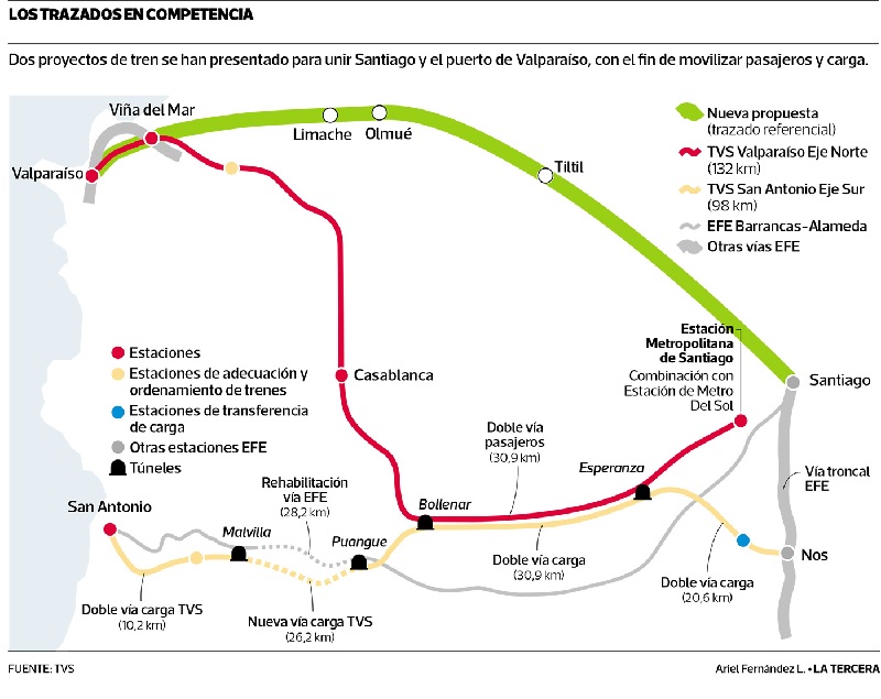 La nueva propuesta también incluye transporte de pasajeros y de carga entre el Puerto y la capital, pero el trazado es diferente a la de TVS: este parte en la Estación Mapocho, se dirige al norte hacia Tiltil y luego se desvía al poniente para llegar Olmué y, desde esta ciudad, a Valparaíso. El plan contempla, además, la construcción de un túnel.
