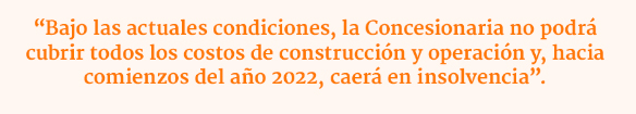 Plantean que “es tal la gravedad de la situación que, bajo las actuales condiciones, la Concesionaria no podrá cubrir todos los costos de construcción y operación y, hacia comienzos del año 2022, caerá en insolvencia”.