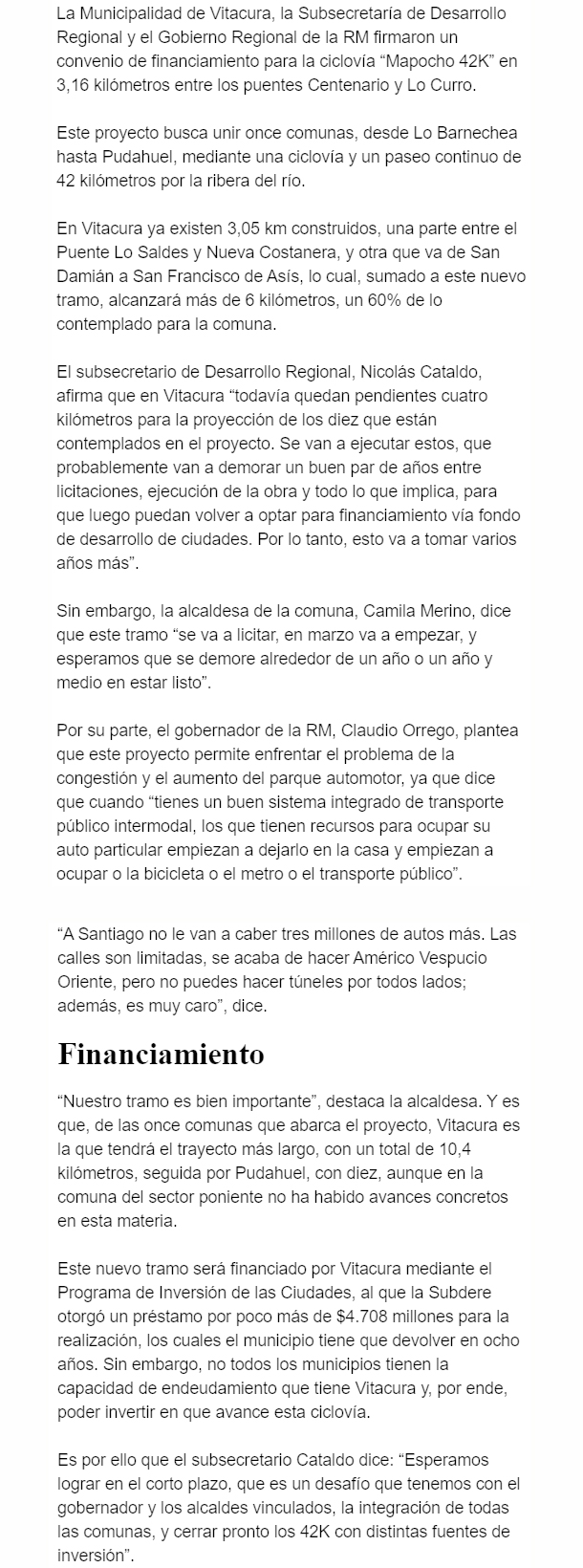 EL MERCURIO – A diferencia de otros municipios donde aún no hay gran avance del proyecto, con este tramo la comuna del sector oriente alcanzaría el 60% del trayecto total contemplado en su zona.