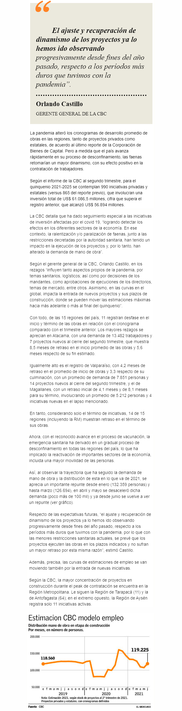 EL MERCURIO – No obstante, el gerente de la CBC, Orlando Castillo, ve un repunte en el dinamismo de los proyectos a medida que casi la totalidad de las regiones avanzan en el proceso de desconfinamiento.