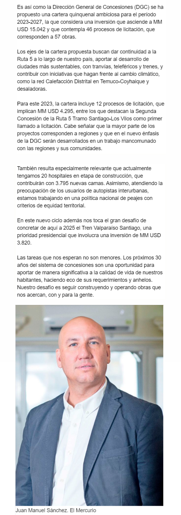 EL MERCURIO – La Dirección General de Concesiones se ha propuesto una cartera quinquenal ambiciosa para el periodo 2023-2027, la que considera una inversión que asciende a MM USD 15.042.