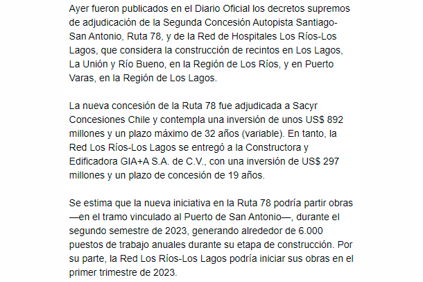 EL MERCURIO – La nueva concesión de la Ruta 78 fue adjudicada a Sacyr Concesiones Chile. En tanto, la Red Los Ríos-Los Lagos se entregó a la Constructora y Edificadora GIA+A.S.A.
