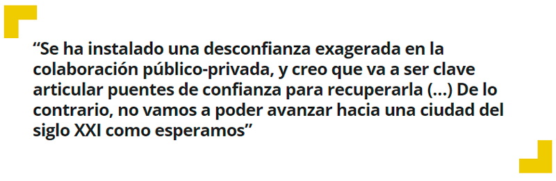 Ese es uno de los principales desafíos para nuestro país, y creo que va a ser uno de los grandes obstáculos también. Se ha instalado una desconfianza exagerada en la colaboración público-privada. Creo que va a ser clave articular puentes de confianza para recuperar esa colaboración y coexistencia entre el sector público y el sector privado. Ese puente lo vamos a tener que hacer aquellos actores que todavía tenemos cierta legitimidad, como la academia y las ongs, porque hoy en día en parte importante de las demandas de la nueva Constitución, o en la agenda política más populista, está la idea de que el Estado tiene que hacerse cargo de todo, y no va a ser capaz de satisfacer esas demandas porque son tan complejas que requieren de un ecosistema donde además el sector privado, las pymes y las grandes empresas. Todos tenemos algo que aportar, y por lo tanto ahí hay un esfuerzo grande de recomponer las confianzas para efectivamente activar estos ecosistemas. De lo contrario, no vamos a poder avanzar hacia una ciudad del Siglo XXI como esperamos.