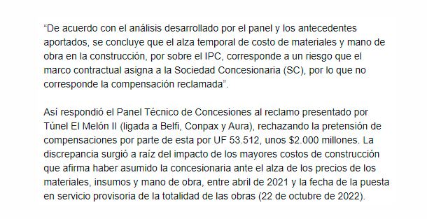 EL MERCURIO – Se concluye que el alza temporal de costos de materiales y mano de obra en la construcción corresponde a un riesgo que el marco contractual asigna a la Sociedad Concesionaria.