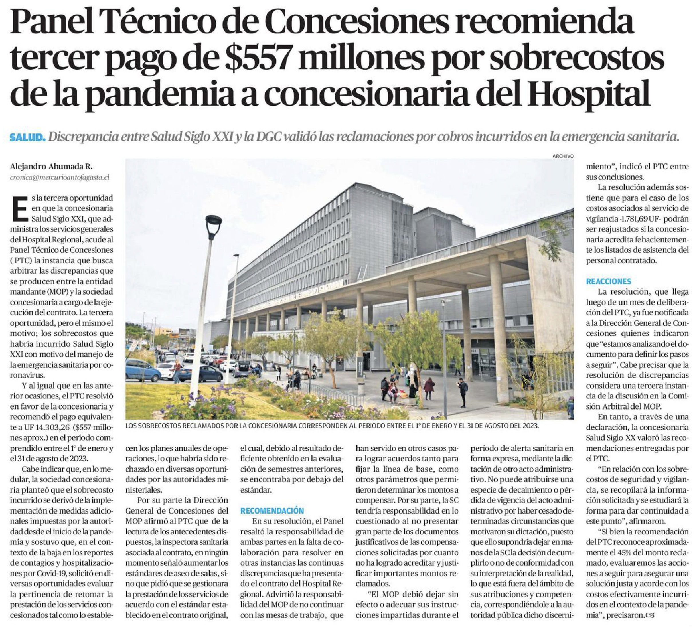 EL MERCURIO ANTOFAGASTA – Discrepancia entre Salud Siglo XXI y la DGC validó las reclamaciones por cobros incurridos en la emergencia sanitaria.