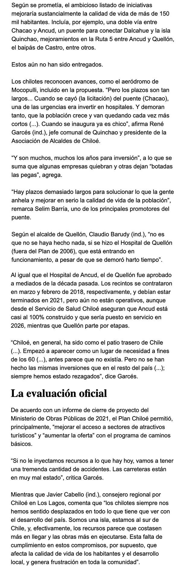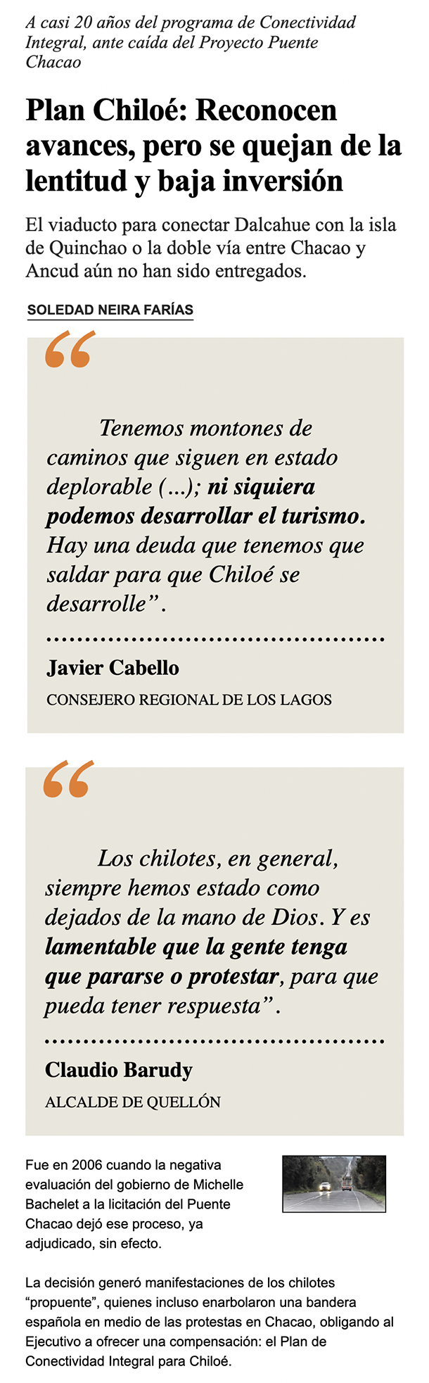 EL MERCURIO – El viaducto para conectar Dalcahue con la isla de Quinchao o la doble vía entra Chacao y Ancud aún no han sido entregados.