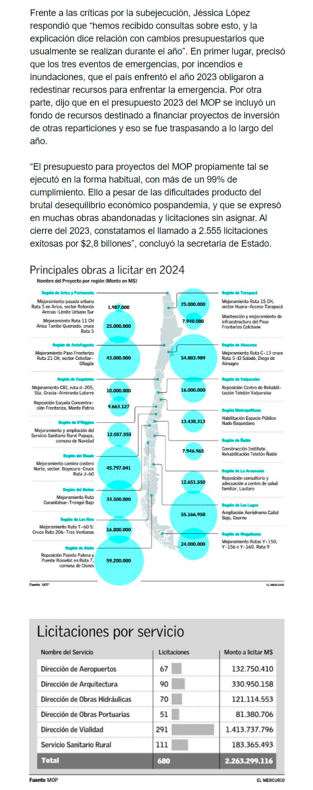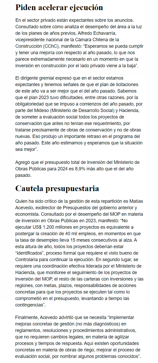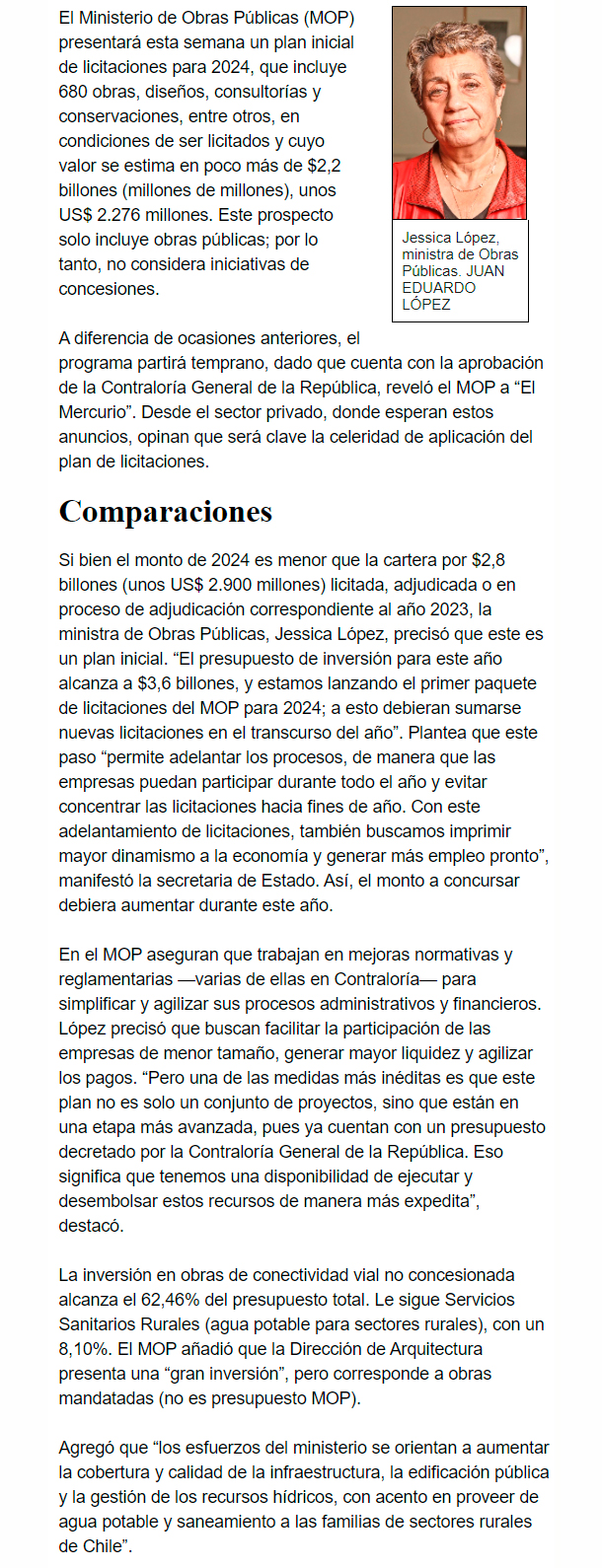 EL MERCURIO – Ministerio adelanta programa de iniciativas de 2024. Manifestaron que el catastro ya pasó por Contraloría, lo que permitiría una ejecución “más expedita”