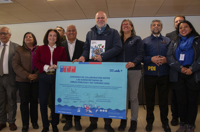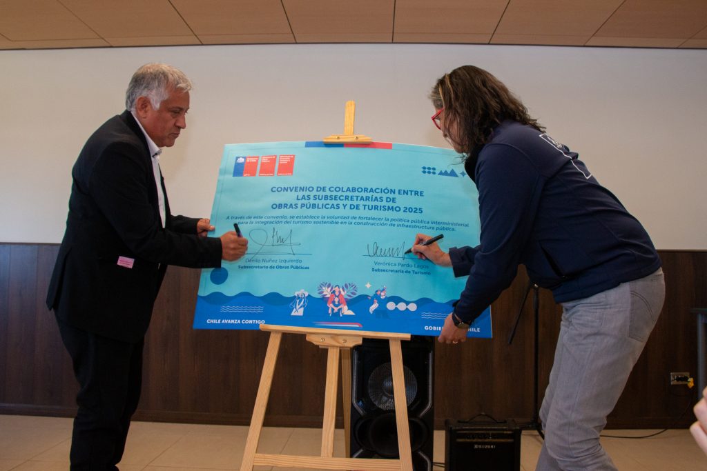 MOP – Aysén, 3 de abril de 2025.- Con la participación del Vicepresidente de la República, Álvaro Elizalde, el subsecretario de Obras Públicas, Danilo Núñez, y la subsecretaria de Turismo, Verónica Pardo, firmaron un convenio para incorporar el turismo sostenible entre los proyectos de infraestructura pública.