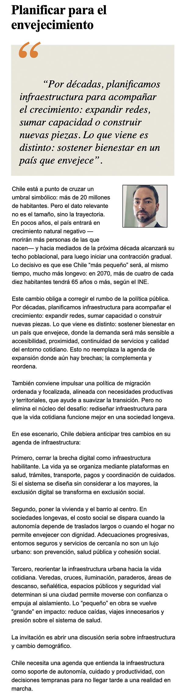 MUNDO MAYOR – EL MERCURIO – “Por décadas, planificamos infraestructura para acompañar el crecimiento: expandir redes, sumar capacidad o construir nuevas piezas. Lo que viene es distinto: sostener bienestar en un país que envejece”.