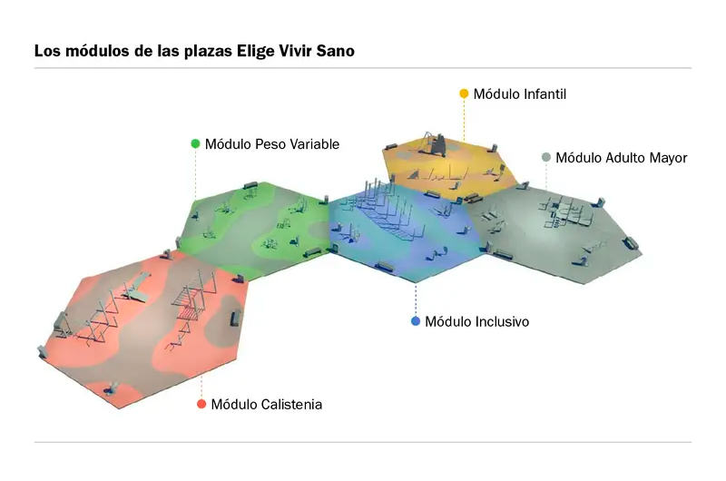 Los cinco módulos contemplados en cada Plaza son los siguientes: calistenia, peso variable, inclusivo, infantil y adulto mayor. Además, cuentan con un suelo de caucho, bebederos (incluso para mascotas), iluminación, mobiliario urbano, letreros informativos y cubierta tensada.