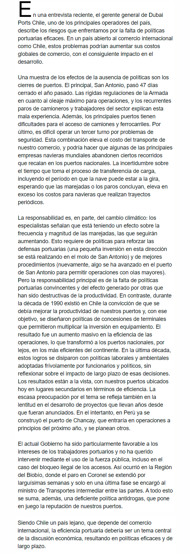 EL MERCURIO – En la última década se han disipado los logros que el país había llegado a alcanzar en la operación eficiente de sus puertos