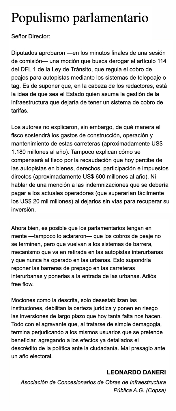 EL MERCURIO – Diputados aprobaron una moción que busca derogar el artículo 114 del DFL 1 de la Ley de Tránsito, que regula el cobro de peajes para autopistas mediante los sistemas de telepeaje o tag.