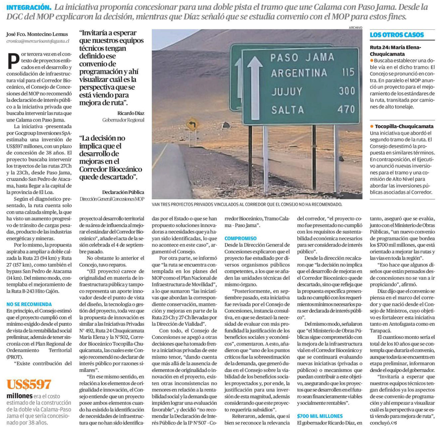 EL MERCURIO DE ANTOFAGASTA – La iniciativa proponía concesionar para una doble pista el tramo que une Calama con Paso Jama.