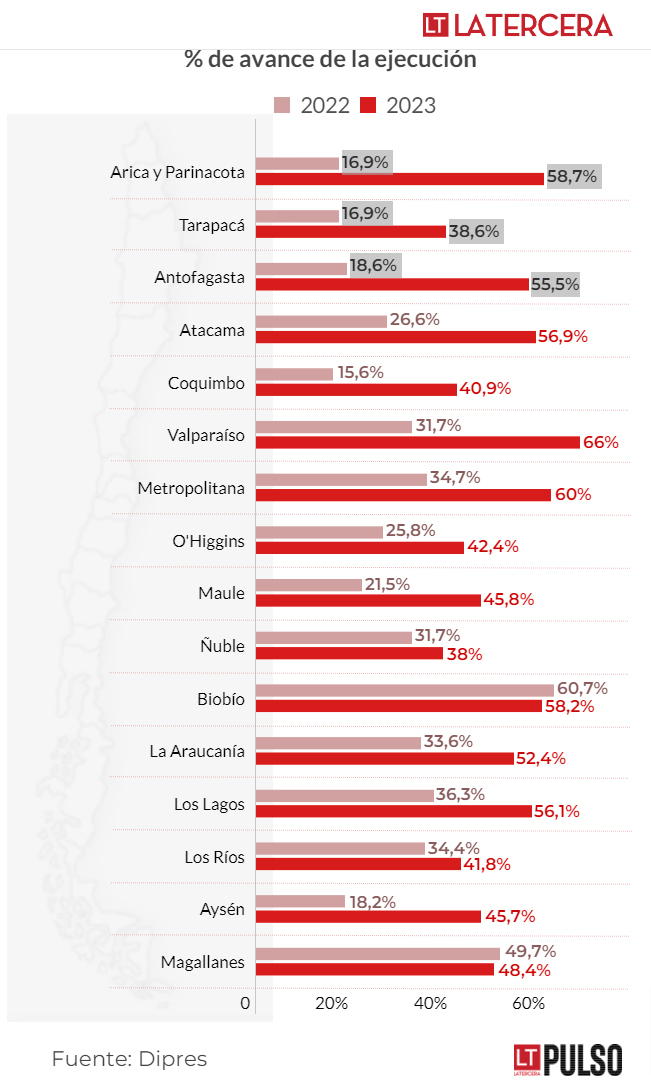 Las regiones más avanzadas son Valparaíso con 66% y la Metropolitana con 60%. En 2022, en este mismo período el avance de la ejecución era de 31,7% y 34,7% respectivamente. Luego aparece Arica y Parinacota con 58,7% frente a 16,9% que había el año pasado. Le sigue Biobío con un estado de ejecución de 58,2% mientras que en 2022 a esta misma fecha era de 60,7%, Atacama con 56,9%.