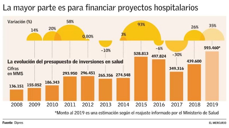 Sin embargo, la situación para el Ministerio de Salud parece ser opuesta. Según confirmó Luis Barrios, jefe de la División de Inversiones de la cartera, “para el presupuesto de Inversiones en Infraestructura de Salud y Equipamiento 2019 hemos trabajado con la Dirección de Presupuestos una propuesta que será presentada a los parlamentarios, donde se considera un incremento en torno al 35%”.