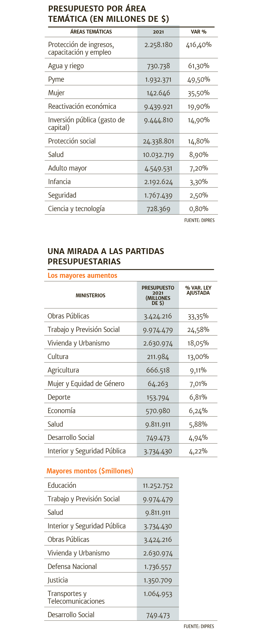 El Ejecutivo identificó ocho ejes temáticos en que se gastarán los recursos del sector público el próximo año: protección de los ingresos, capacitación y creación de empleo; fortalecer la salud, enfrentar el coronavirus y avanzar en salud mental; la recuperación económica; entregar protección a las familias, la infancia, las mujeres y los adultos mayores; impulsar la micro, pequeña y mediana empresa; mejorar la seguridad; apoyar el turismo y avanzar en la recuperación desde los gobiernos locales.