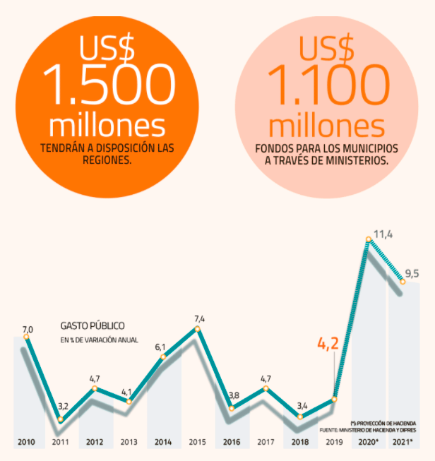 El próximo año, el gasto público subirá 9,5% frente a la ley 2020 ajustada, con lo que sumará US$ 73.234 millones. Se trata de la segunda mayor tasa de expansión de la última década, superada solo por el avance de 11,4% previsto para este año, ejercicio marcado por los gastos derivados de la crisis social de octubre de 2019 y de la emergencia sanitaria.