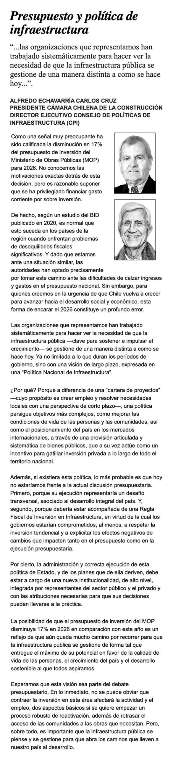 EL MERCURIO –Las organizaciones que representamos han trabajado sistemáticamente para hacer ver la necesidad de que la infraestructura pública  -clave para sostener e impulsar el crecimiento- se gestiones de una manera distinta a como se hace hoy.  Ya no limitada a lo que duran los períodos de gobierno, sino con una visión de largo plazo, expresada en una “Política Nacional de Infraestructura”