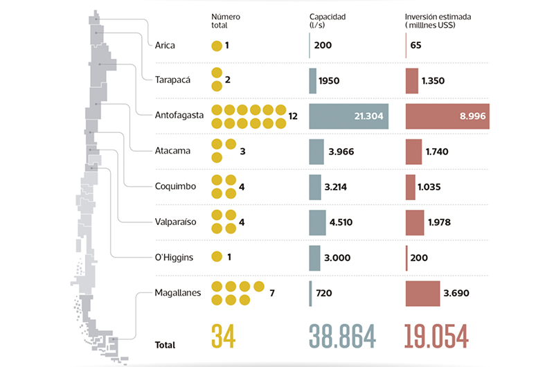 El levantamiento de información arrojó que, actualmente, a nivel nacional existen 24 plantas desaladoras de agua de mar de tamaño industrial, con una capacidad superior de producción de agua más de 20 litros por segundo, que, en total, suman una capacidad instalada de 10.500 litros por segundo (l/s).