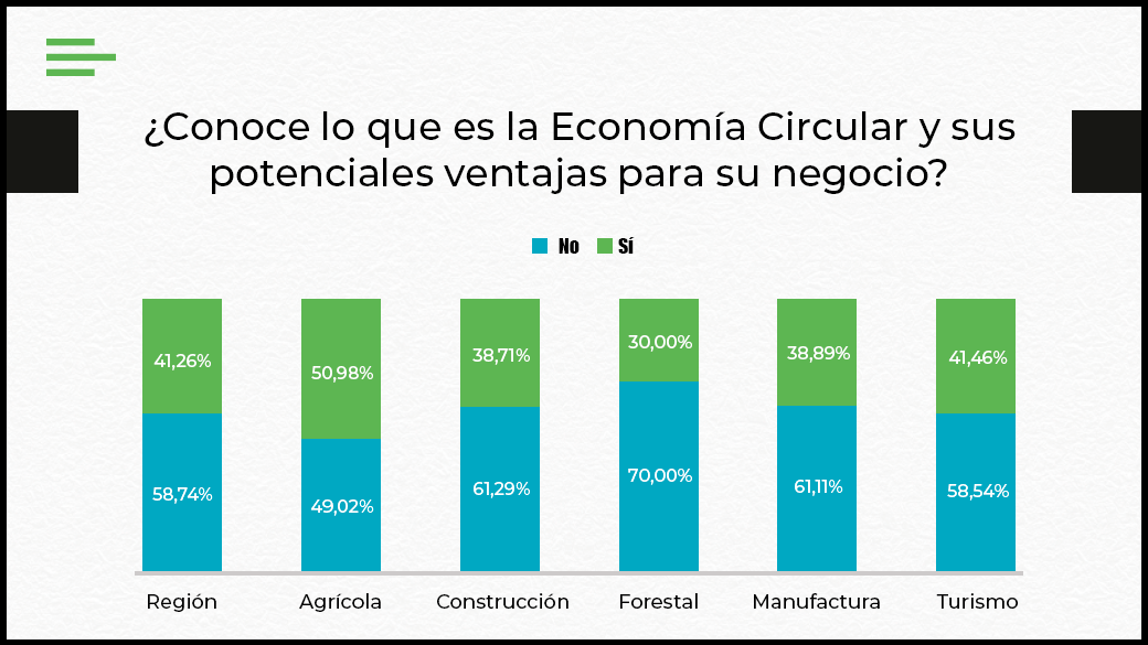 Y la primera mirada, el resultado global, no es muy alentador: el índice de circularidad de la región es de 3.3 en una escala de 1 a 7, lo que la instala en un nivel bajo. Un 65% de las empresas de la región está en un nivel bajo, un 29% en un nivel medio y solo un 6% en el segmento alto de circularidad, a lo que se suma que un 59% de los encuestados desconoce qué es la economía circular y qué ventajas puede tener para su negocio.