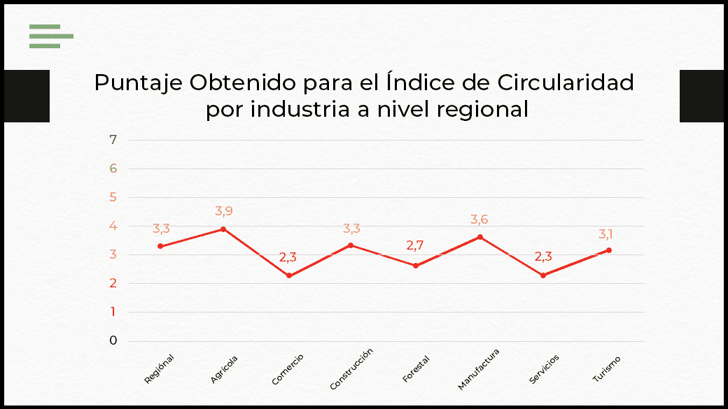 Al hacer un análisis por sector económico, la encuesta muestra realidades dispares entre los distintos sectores económicos de la región. Los sectores mejor evaluados son Agricultura (con un índice de circularidad de 3,9) y Manufactura (3,6). En el primero caso, plantea Pamela Ríos, esto tiene relación con prácticas históricas del sector que quizás no se habían valorado y que por lo mismo no se les saca provecho, pero que ayudan a ir avanzando hacia la circularidad. Un ejemplo clásico es el uso de estiércol como abono para praderas, pero a ello se han sumado el uso eficiente de tecnologías para el consumo de agua o la disminución de residuos. También el hecho de que gran parte de los productos agrícolas van a otros procesos industriales y no necesariamente a consumidor final, lo que disminuye el uso de packaging.
