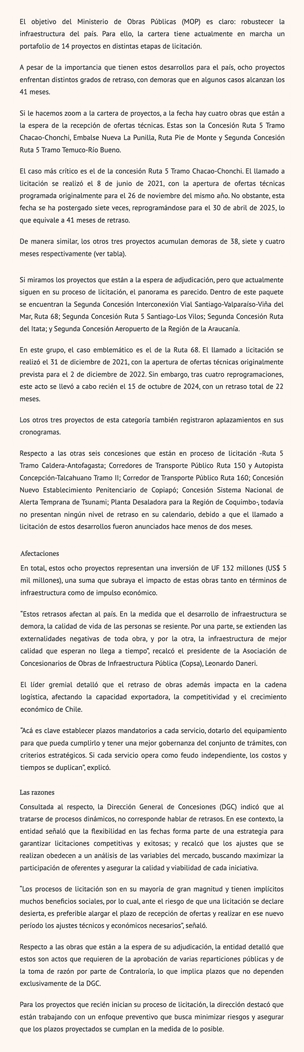 DIARIO FINANCIERO – Ocho proyectos clave de la cartera enfrentan demoras en sus procesos de licitación, desarrollos que representan una inversión de US$ 5 mil millones