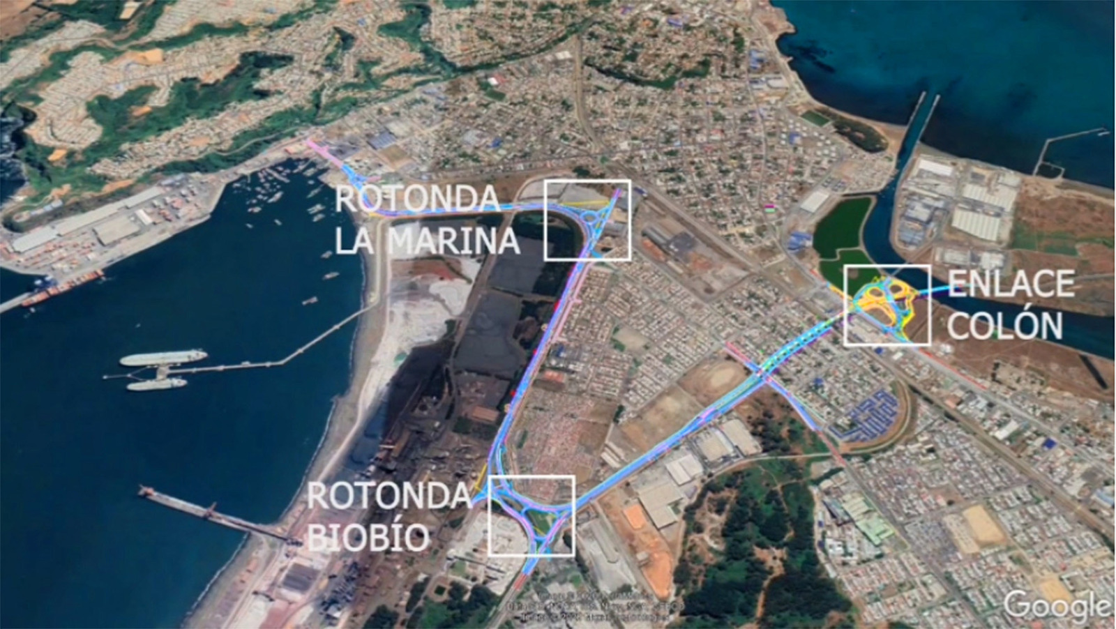 La iniciativa, según se indicó, se dividirá en 2 tramos, el primero a construir va desde el empalme con la Ruta Interportuaria, incluyendo el paso superior Colón Echeverría y doble calzada de Gran Bretaña hasta llegar a la rotonda Cementos Biobío existente.
