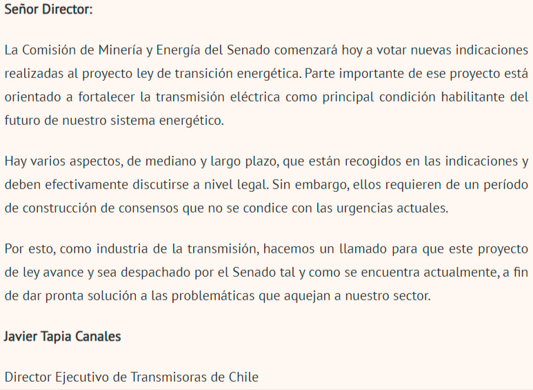 DIARIO FINANCIERO – Como industria de la transmisión hacemos un llamado para que este proyecto de ley avance y sea despachado al Senado tal y como se encuentra actualmente