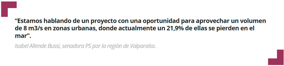 “Actualmente y, luego de un largo proceso, solo contamos con una Ley de Aguas Grises, con un alcance muy limitado y para determinados usos. En cambio, aquí estamos hablando de un proyecto con una oportunidad para aprovechar un volumen de 8 m3/s (metros cúbicos por segundo) en zonas urbanas, donde actualmente un 21,9% de ellas se pierden en el mar”, señala la parlamentaria.
