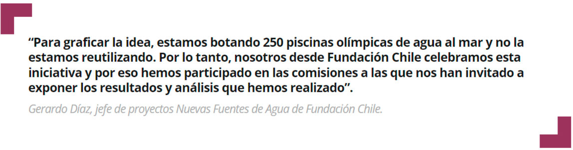 Gerardo Díaz, jefe de proyectos Nuevas Fuentes de Agua de Fundación Chile (FCh), recalca la importancia de avanzar con este proyecto de ley. “Para graficar la idea, estamos botando 250 piscinas olímpicas de agua al mar y no la estamos reutilizando. Por lo tanto, nosotros desde Fundación Chile celebramos esta iniciativa y por eso hemos participado en las comisiones a las que nos han invitado a exponer los resultados y análisis que hemos realizado”.