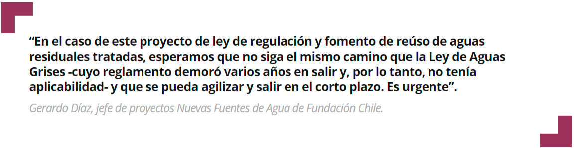“Pero no estamos en tiempos de esperar muchos años para que este proyecto se tramite y se ejecute. Un ejemplo es la Ley de Aguas Grises, cuyo reglamento demoró varios años en salir y, por lo tanto, no tenía aplicabilidad. En el caso de este proyecto de ley de regulación y fomento de reúso de aguas residuales tratadas, esperamos que no siga el mismo camino y que se pueda agilizar y salir en el corto plazo. Es urgente”, sentencia el integrante de Escenarios Hídricos 2030, de FCh.