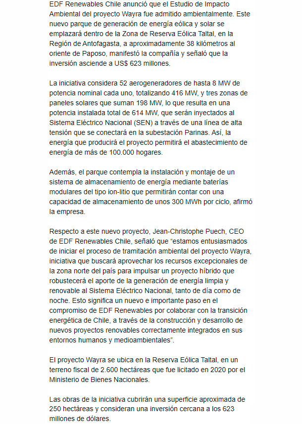 EL MERCURIO – La iniciativa considera 52 aerogeneradores de hasta 8 MW de potencia nominal cada uno, totalizando 416 MW y tres zonas de paneles solares que suman 198 MW.