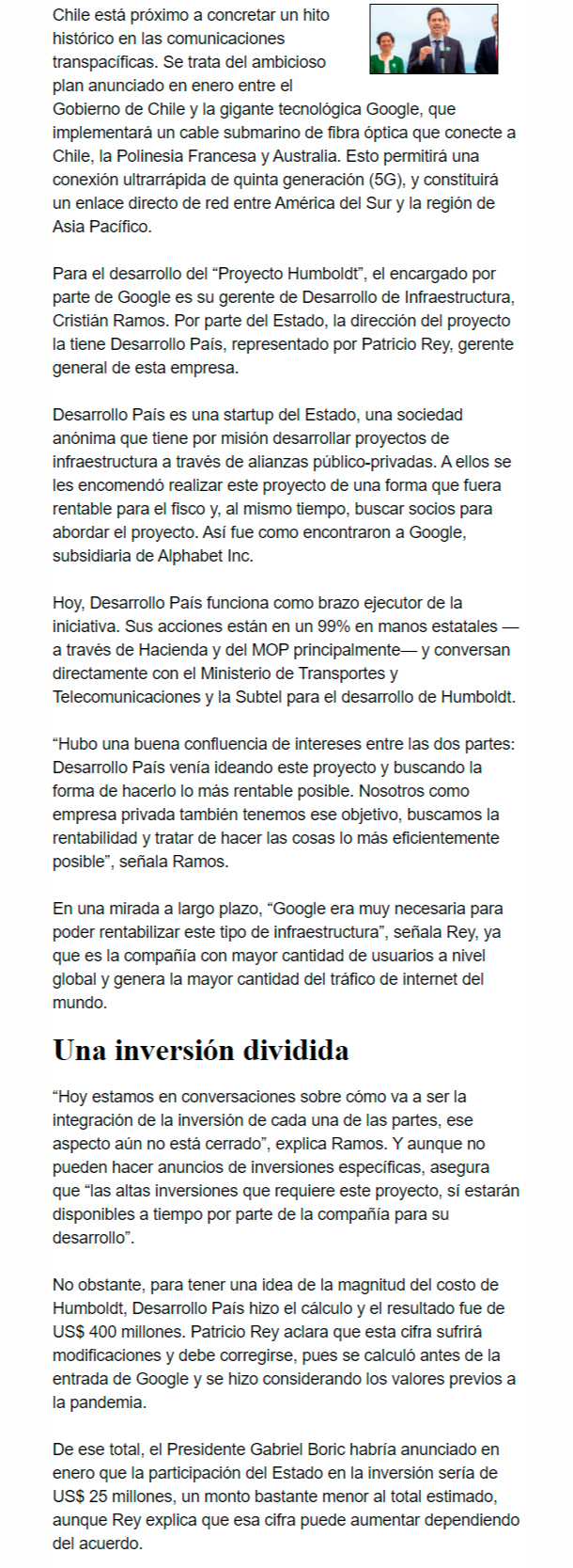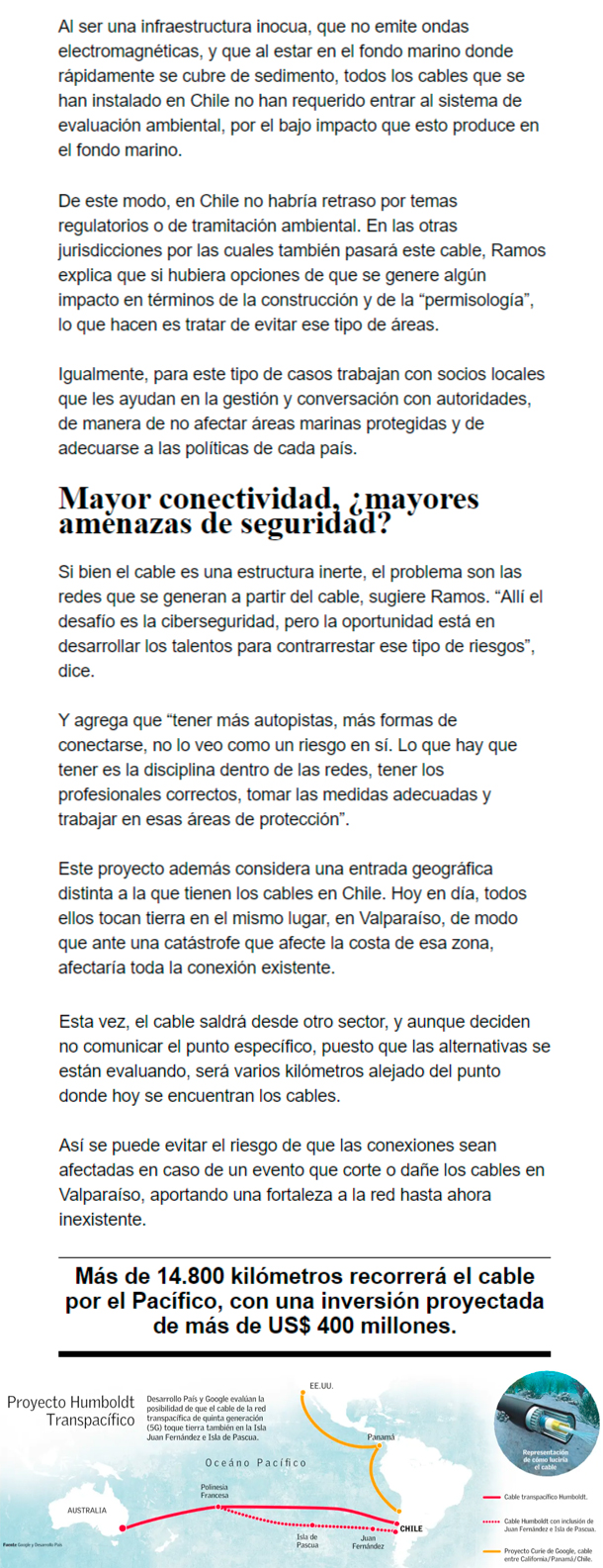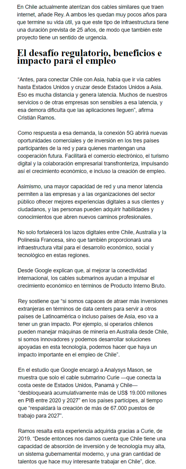 EL MERCURIO – La gigante tecnológica Google y Desarrollo País han marcado el itinerario para el proyecto de la red submarina que conectará Chile, la Polinesia Francesa y Australia