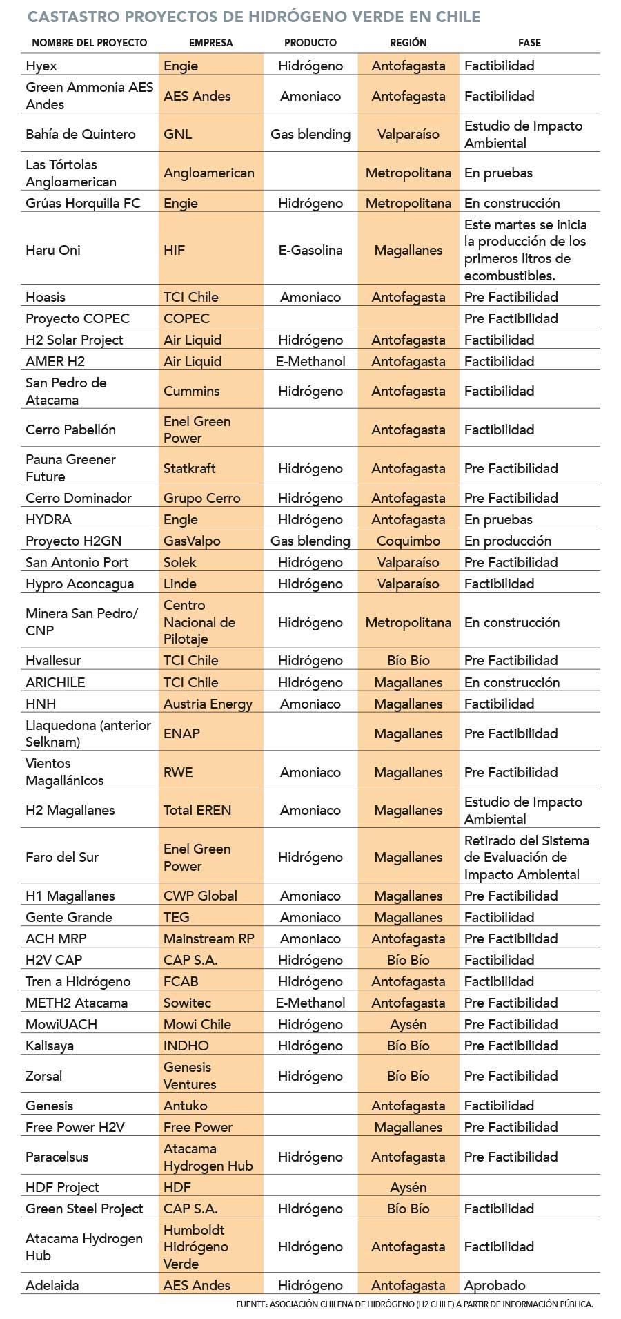 En el detalle, por ejemplo, destacan en factibilidad Hyex de Engie, Green Ammonia de AES Andes, y Gente Grande de TEG. Esta última está enfocada en una producción aproximada de 1,5 millón de toneladas al año, la cual involucra una inversión de alrededor de US$ 6.000 millones. Otro relevante en esta etapa es HNH de Austria Energy y Copenhagen Infrastructure Partners (CIP) cuya inversión sería de US$ 3.000 millones.