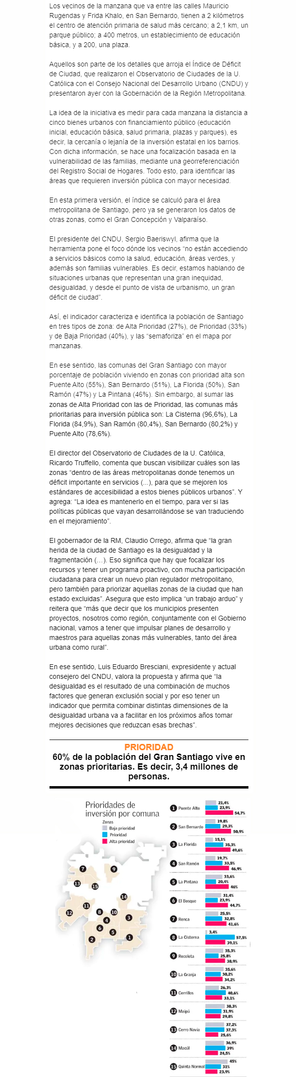 EL MERCURIO – La medición evalúa las zonas con menores accesos en áreas como salud, educación, plazas y parques y las prioriza según las necesidades para focalizar la inversión pública.