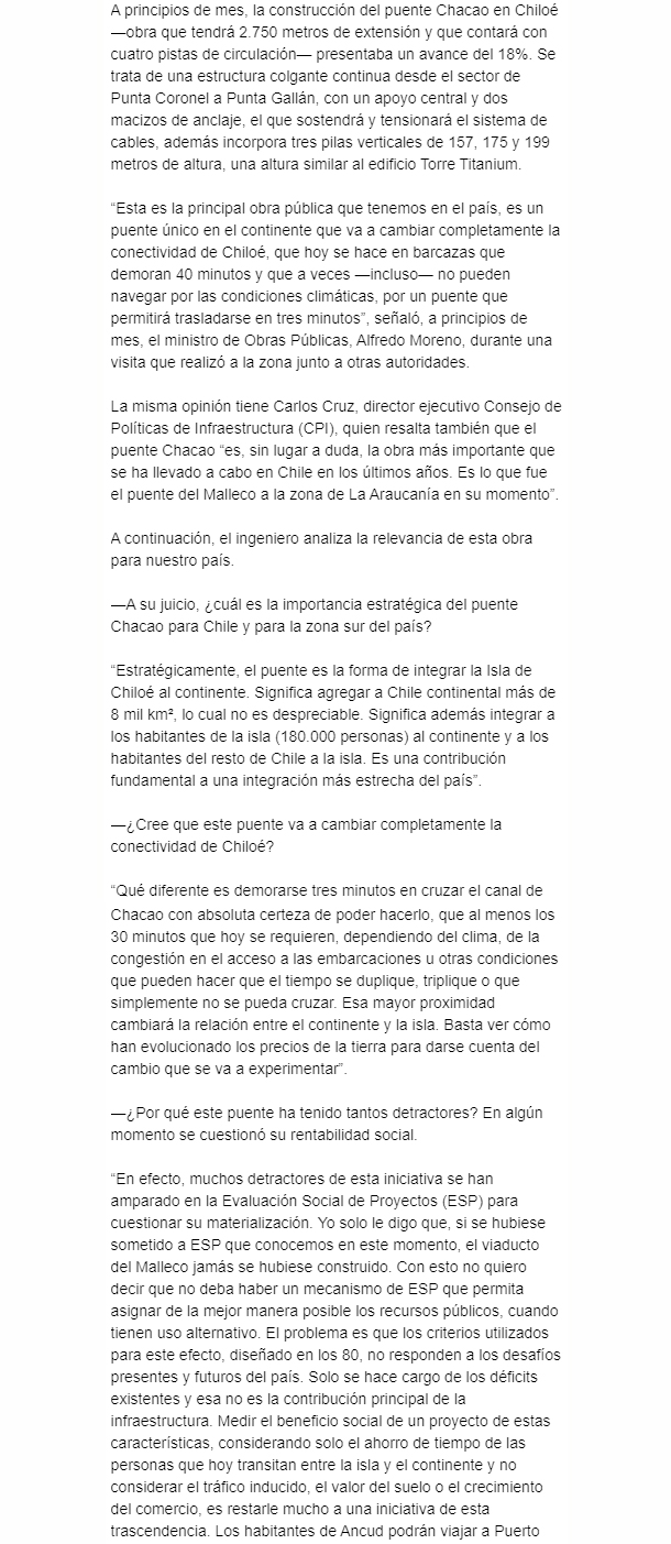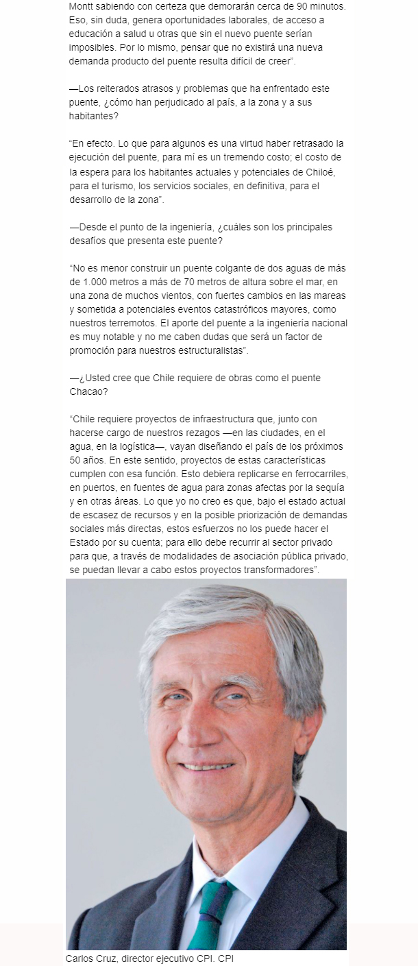 EL MERCURIO – A su juicio, Chile requiere proyectos de infraestructura que, junto con hacerse cargo de los rezagos, vayan diseñando el país de los próximos 50 años. “Lo que para algunos es una virtud haber retrasado la ejecución del puente, para mí es un tremendo costo”.