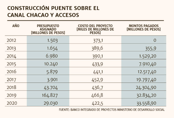 El contrato fue a suma alzada, adjudicado a $ 360.134 millones, el que se va reajustando de acuerdo a la variación del IPC. Según datos del Banco Integrado de Proyectos Ministerio de Desarrollo Social, para 2020 se estima que ese valor llegará a unos $ 422,5 mil millones.