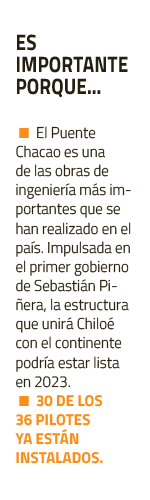 A la fecha, el puente de 2.750 metros que unirá la Isla de Chiloé con el continente ya tiene 30 de 36 pilotes de la nave central listos y en las próximas semanas se debería comenzar a trabajar en el norte y sur del canal, para lo cual se han estado preparando los terrenos y equipos, así como materiales.