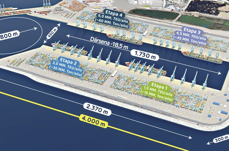 El proyecto se desarrollará gradualmente en cuatro etapas, de acuerdo con la proyección de demanda y, en plena operación, tendrá una capacidad para transferir 6 millones de TEU al año que son equivalentes a cerca de 60 millones de toneladas de carga. Además, el complejo podrá recibir, en forma simultánea, hasta ocho buques de 400 metros de eslora.